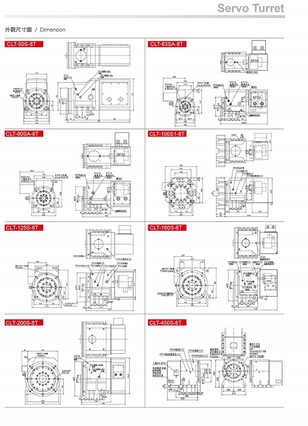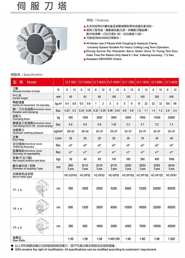 伺服刀塔 CLT-50S, CLT-63SA ,CLT-80SA ,CLT-100S1 ,CLT-125S ,CLT-160S ,CLT-200S ,CLT-450S 全系列采用 3 片離合齒及油壓緊鎖耐用性高適合重切削。 使用三菱馬達、驅動器為動力源,來驅動刀盤旋轉,動作快速轉一刀位只需 0.1 秒,定位精度 ±2 秒。 可接受 OEM/ODM 訂單制作。