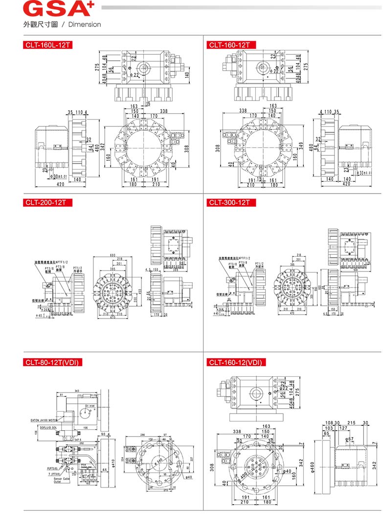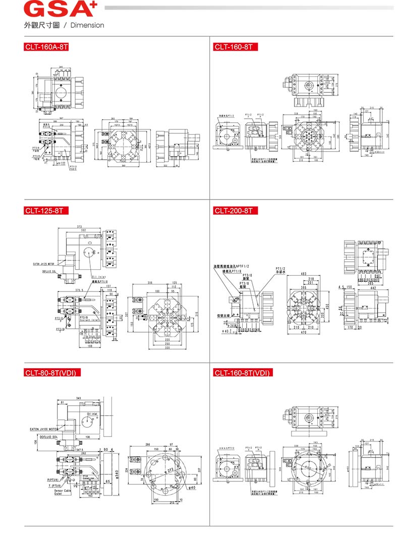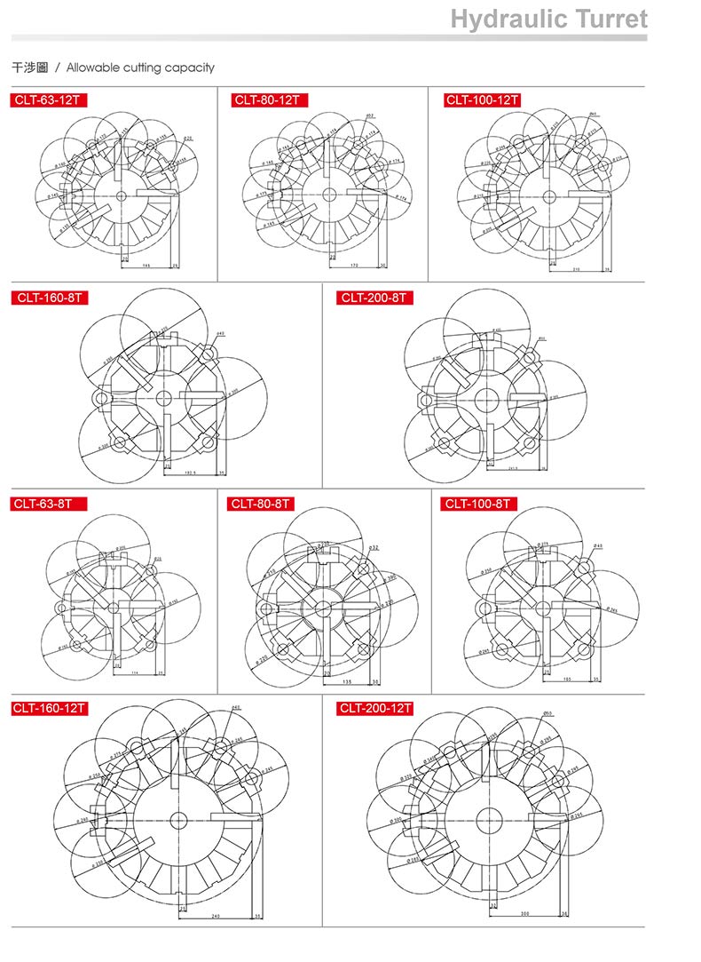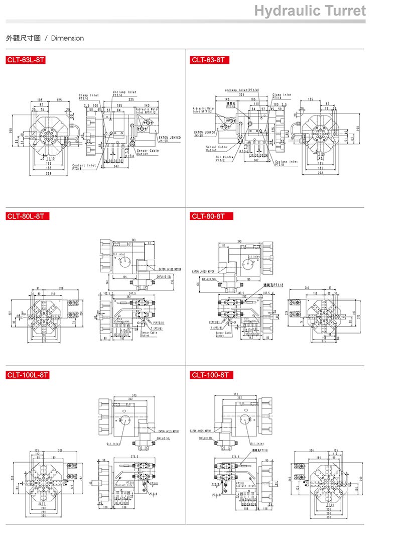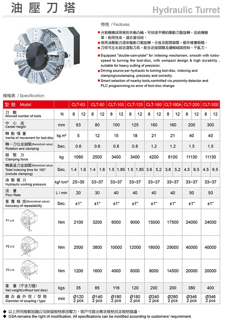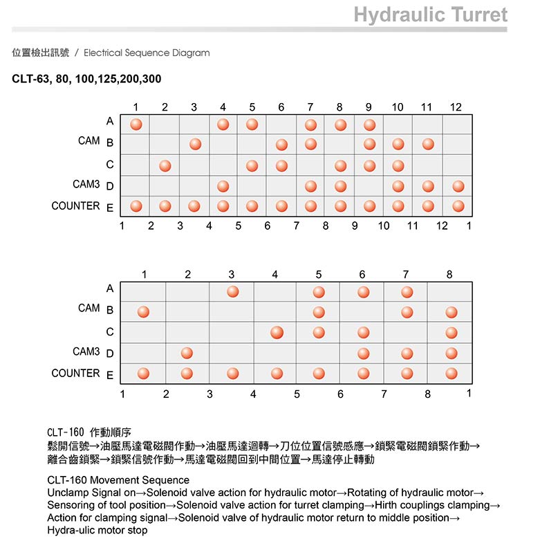 油壓刀塔 CLT-63 ,CLT-80 ,CLT-100 ,CLT-125 ,CLT-160 ,CLT-200 ,CLT-300 分割機構采用版型共軛凸輪,可快速平問的驅動刀盤旋轉,且結構簡單,耐用性高,適合重切削。 使用油壓動力源來驅動刀盤旋轉、分度及松開鎖緊,動作確實順暢。 刀塔可左右就近選取刀具,配合進接開關及邏輯線路控制,不亂刀。